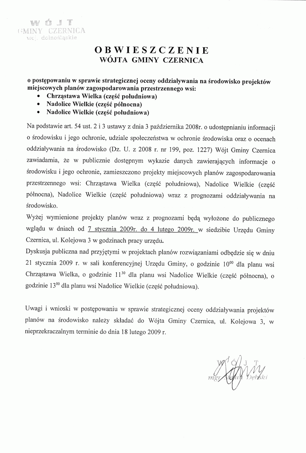 | Obwieszczenie - 2009-01-06 o postepowaniu w sprawie strategicznej oceny oddzialywania na środowisko projektów miejscowych planów zagospodarowania przestrzennego wsi Chrząstawa Wlk (cz. południowa), Nadolice Wlk. (cz. południowa i pólnocna) obwieszczenie.gif (177.39 Kb) |